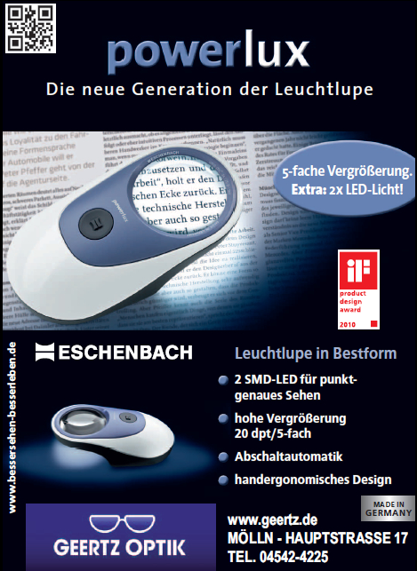 Um den Anforderungen der Zielgruppe in Zukunft noch besser gerecht zu werden, erweitert das Nürnberger Optikunternehmen Eschenbach die Produktrange der Leuchtlupe powerlux um zwei weitere Vergrößerungen: Zur bisherigen Lupe mit 5-fachem Vergrößerungsfaktor (20 Dioptrien) stehen ab sofort 2 weitere Linsenvarianten mit 3,5-facher (14 Dioptrien) bzw. 7-facher (24 Dioptrien) Vergrößerung zur Auswahl. Auch bei diesen sorgen zwei SMD-LEDs für noch besseres, punktgenaues Sehen und entspanntes Lesen. Wie gewohnt mit hochwertiger, asphärischer Optik der Linsen, ohne verzerrtes, irritierendes Abbild des Leseguts.